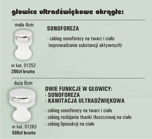 - Głowice okrągłe KAWITACJA ULTRADŹWIĘKOWA i SONOFOREZA stosować do zabiegu: sonoforezy na twarz i ciało, rozbijania tkanki tłuszczowej na ciało oraz, zabieg liposukcji na ciało